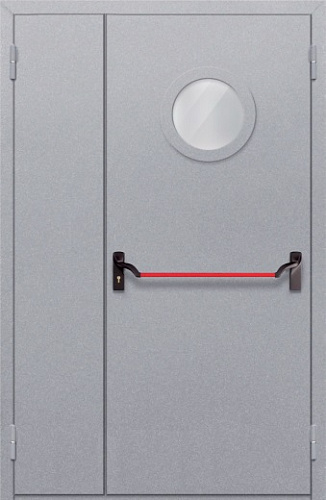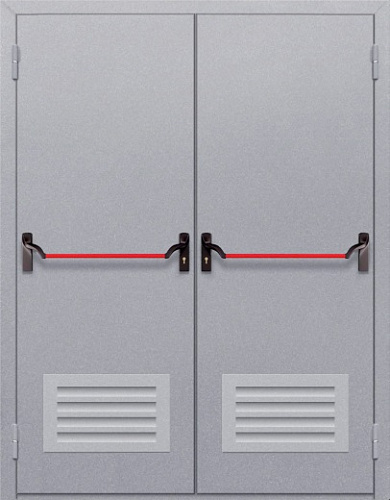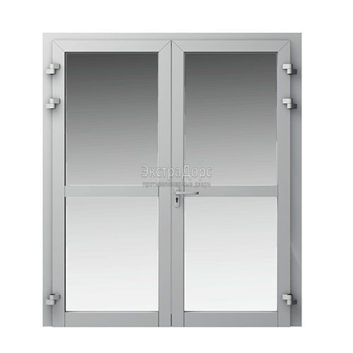 Двухстворчатая огнеупорная дверь EI 60 с выпадающим порогом, стеклом и решеткой
