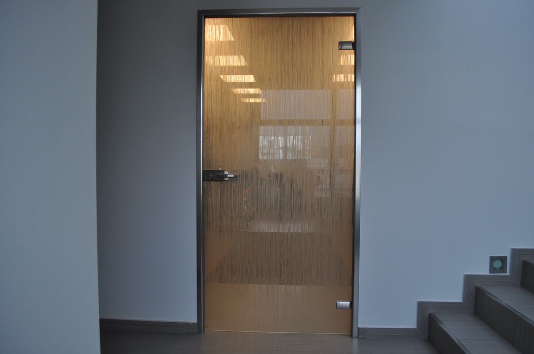 Противопожарная безрамная дверь со стеклом в БЦ в Москве